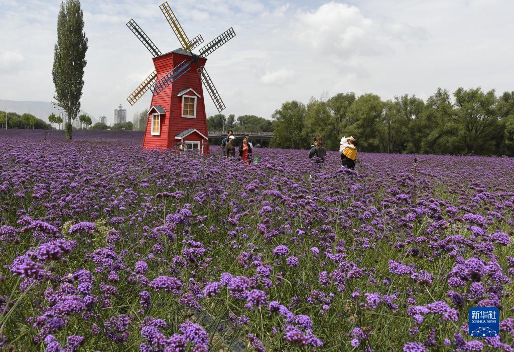 9月4日,游客在永靖縣劉家峽鎮黃河花堤上賞花。