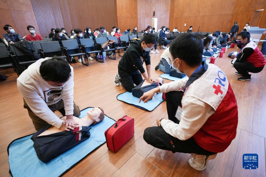 11月28日,冬奧學(xué)生志愿者在急救技能培訓上學(xué)習心肺復蘇術(shù)。新華社記者 鞠煥宗 攝