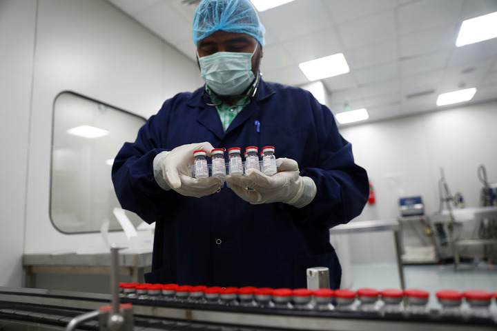 在埃及吉薩的埃及生物制品與疫苗公司疫苗生產(chǎn)廠(chǎng),工作人員對貼標的新冠疫苗進(jìn)行裝盒前準備(2021年9月6日)。新華社發(fā)(艾哈邁德·戈馬攝)