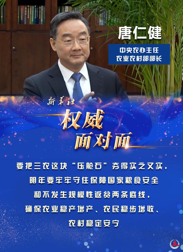 中央經(jīng)濟工作會(huì )議定調明年經(jīng)濟工作,部署保障糧食和重要農副產(chǎn)品供給安全、全面推進(jìn)鄉村振興等任務(wù)。如何發(fā)揮好“三農”工作“壓艙石”作用?全面推進(jìn)鄉村振興如何發(fā)力?日前,中央農辦主任、農業(yè)農村部部長(cháng)唐仁健接受了新華社記者采訪(fǎng)。