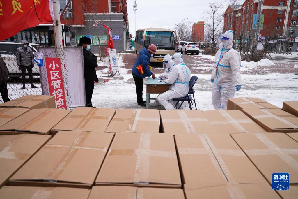 在黑龍江省黑河市愛(ài)輝區一小區,社區工作人員為居民發(fā)放免費生活物資(11月10日攝)。新華社記者 王松 攝