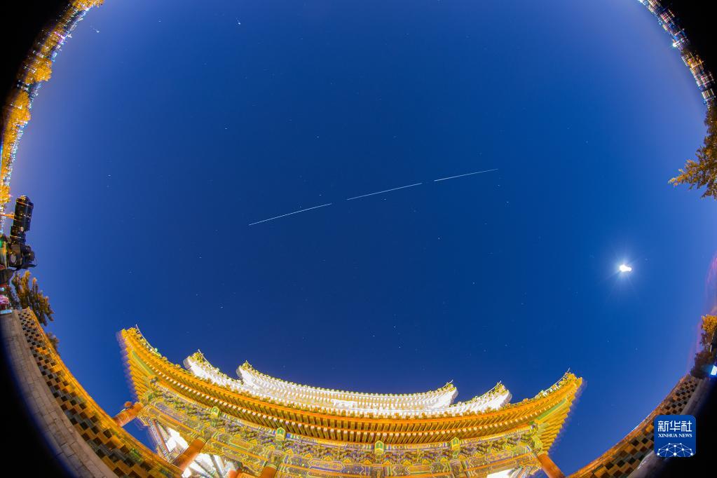 2021年12月17日,在北京景山公園拍攝的中國空間站過(guò)境照片(軌跡為多張照片堆棧)。