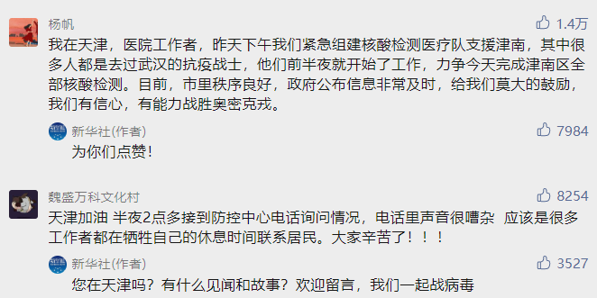 我是天津東麗人,我爸爸昨天晚上十點(diǎn)左右接到通知,開(kāi)始聯(lián)系單位的人員,到了半夜兩點(diǎn)左右出去支援了,到現在還在津南區支援,我本人是大學(xué)生,希望能做志愿,為社區做出微薄貢獻,我也相信天津再次上熱搜將會(huì )是成功戰勝奧密克戎!我們一起加油?。?!