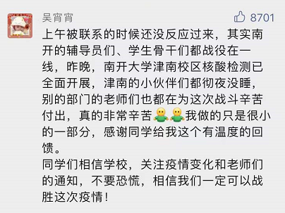 我在天津,醫院工作者,昨天下午我們緊急組建核酸檢測醫療隊支援津南,其中很多人都是去過(guò)武漢的抗疫戰士,他們前半夜就開(kāi)始了工作,力爭今天完成津南區全部核酸檢測。目前,市里秩序良好,政府公布信息非常及時(shí),給我們莫大的鼓勵,我們有信心,有能力戰勝奧密克戎。
