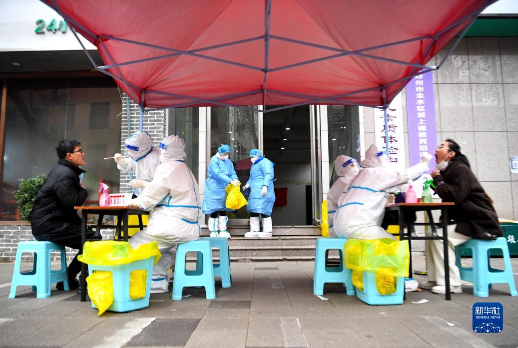 1月10日,人們在鄭州市緯一路一核酸檢測點(diǎn)接受核酸檢測取樣。