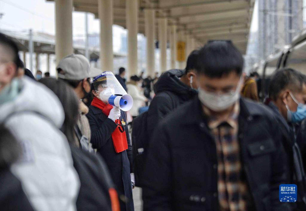 1月28日,寇莉(中)在接送過(guò)站列車(chē)。