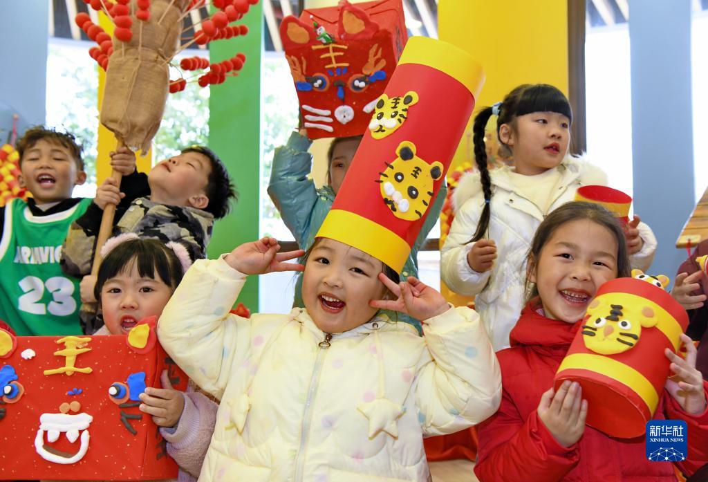 1月12日,福建省武夷山市百花幼兒園的小朋友們在游園活動(dòng)上穿戴自制的虎元素飾品。