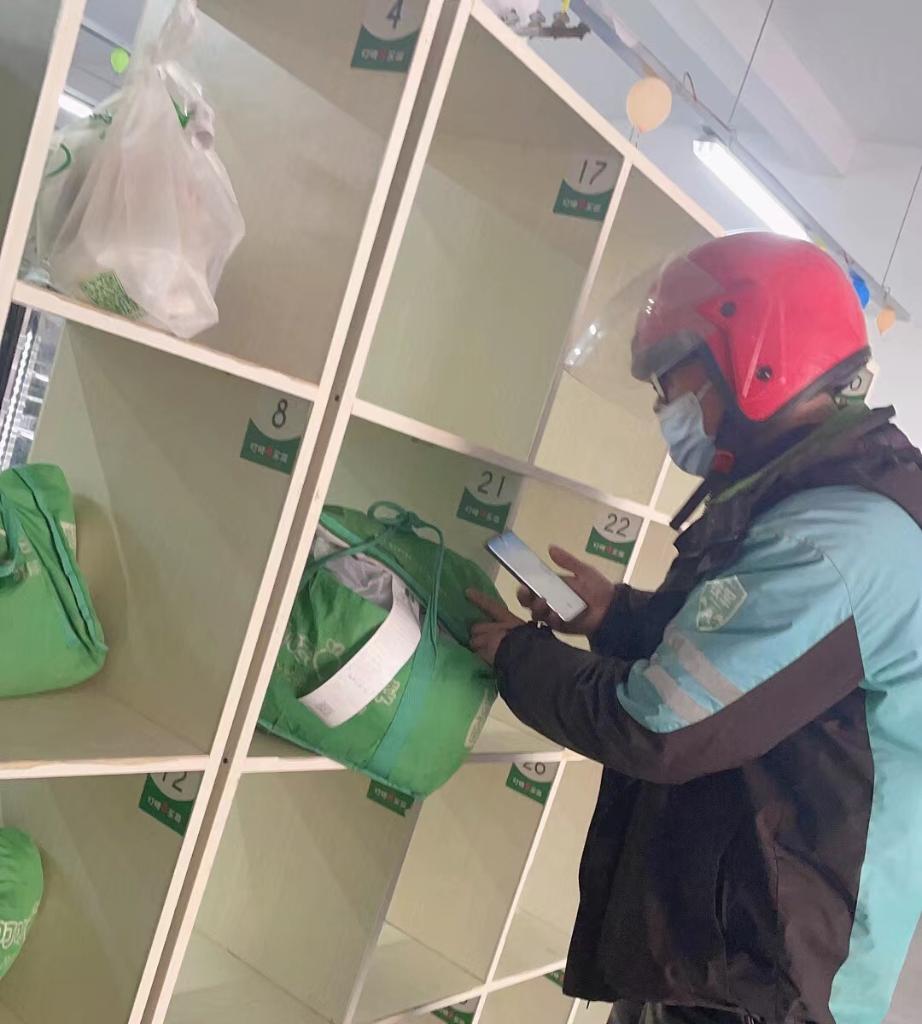 春節里,叮咚買(mǎi)菜新奉站配送小哥在一線(xiàn)工作。(受訪(fǎng)對象供圖)