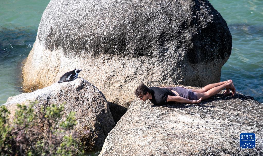 2月5日,一名男子在南非西蒙鎮海灘邊模仿企鵝。