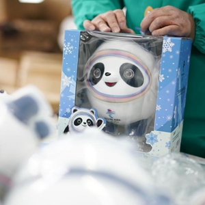 2月8日,工人在特許生產(chǎn)商的車(chē)間里包裝“冰墩墩”。(新華社記者 季春鵬 攝)