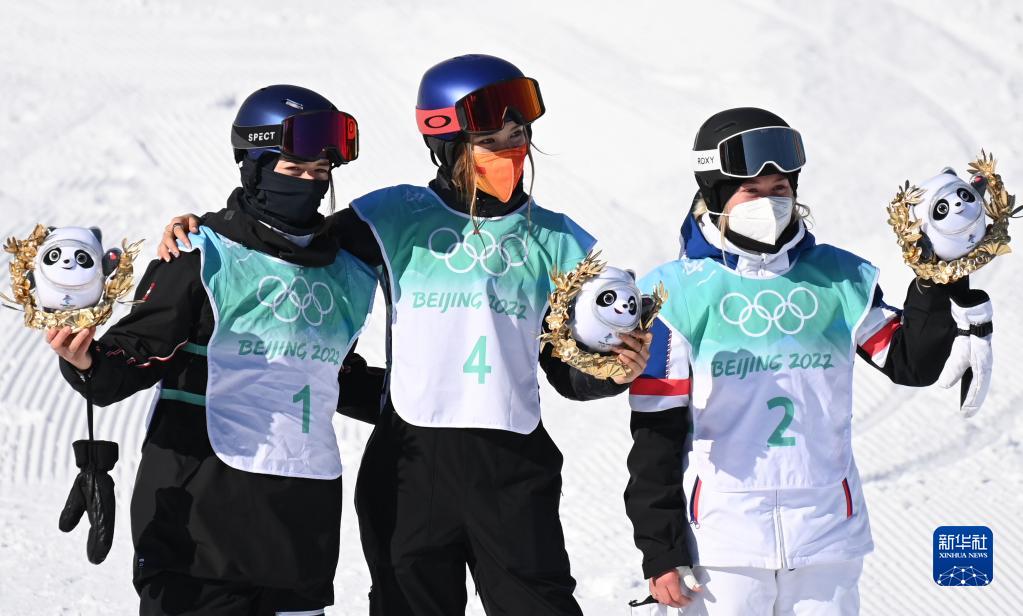 2月8日,奪得冠軍的中國選手谷愛(ài)凌(中)、獲得亞軍的法國選手苔絲、獲得季軍的瑞士選手瑪蒂爾德·格雷莫德在頒發(fā)紀念品儀式上。新華社記者熊琦攝