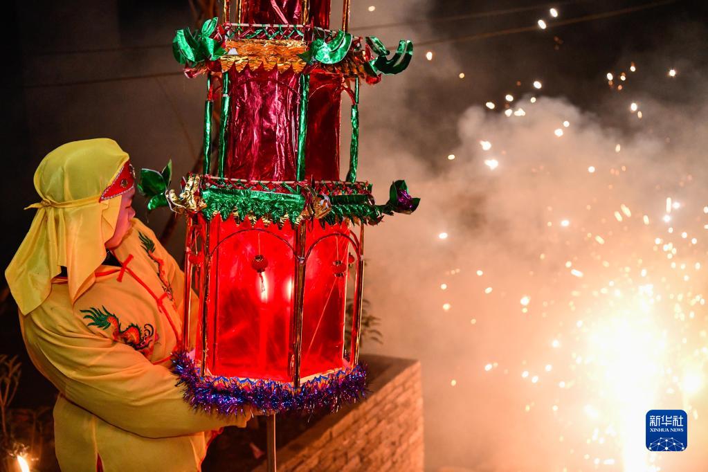 2月7日夜,龍里縣龍山鎮的村民扛著(zhù)花燈參加“亮燈巡寨”活動(dòng)。