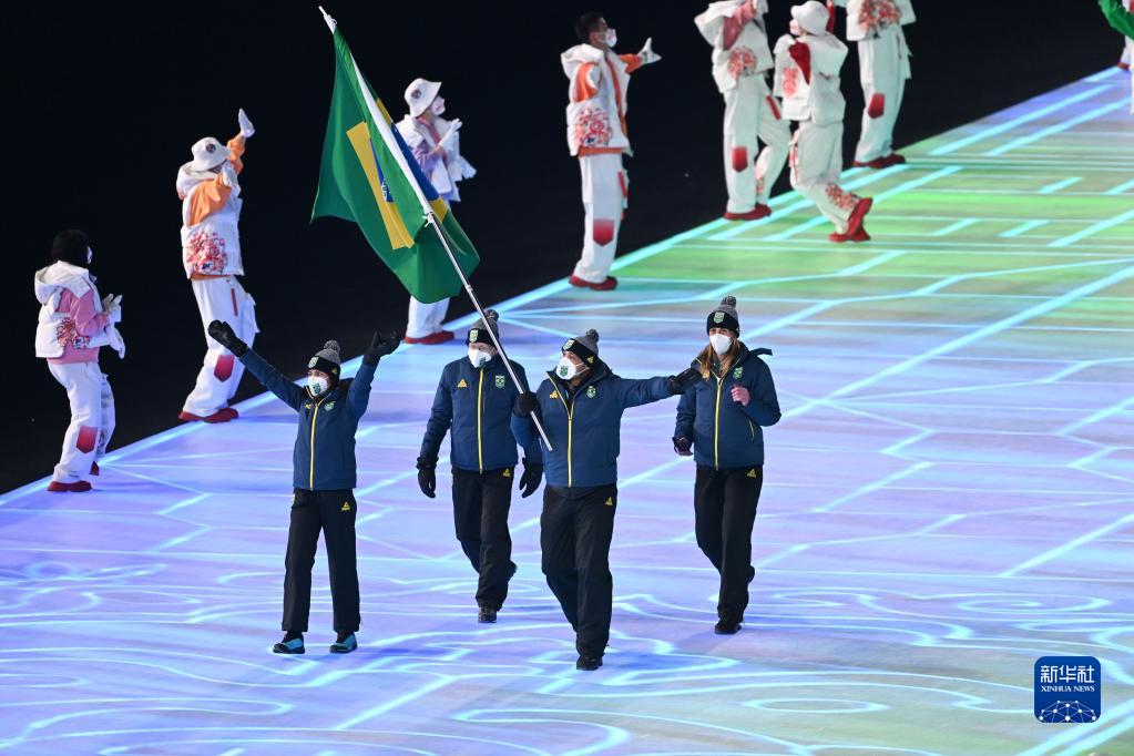 在國家體育場(chǎng),雅克利娜·莫朗(左一)作為巴西代表團旗手之一參加北京冬奧會(huì )開(kāi)幕式。新華社記者 黃宗治 攝