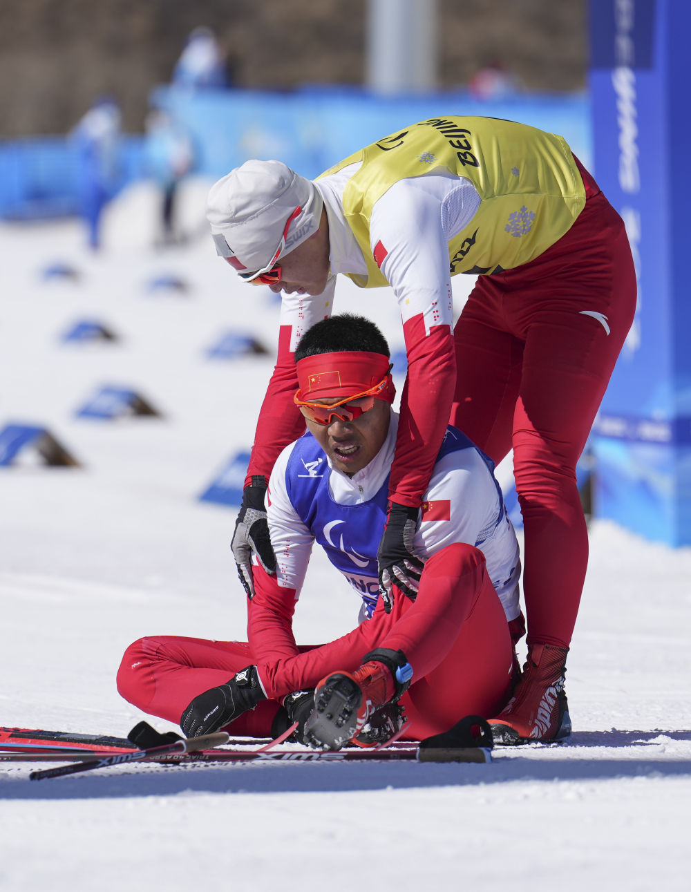 ↑3月7日,在張家口舉行的殘奧越野滑雪男子長(cháng)距離傳統技術(shù)(視障)比賽后,引導員刁程國(上)鼓勵中國選手許賀。視障運動(dòng)員參與殘奧越野滑雪、殘奧冬季兩項和殘奧高山滑雪比賽時(shí),須在引導員的幫助下,合力完成。他們共同追逐夢(mèng)想、挑戰自我,分享快樂(lè )和榮譽(yù)。新華社記者 胡虎虎 攝