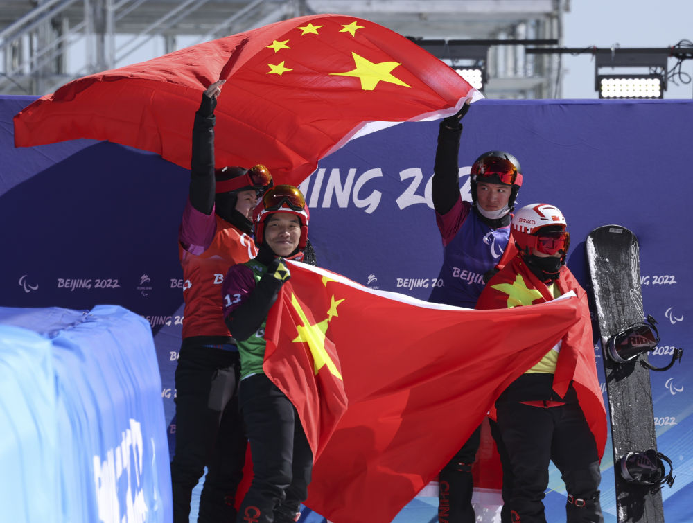 ↑3月7日,獲得季軍的中國選手朱永鋼(后左)、冠軍紀立家(后右)、亞軍王鵬耀(前左)和隊友張義琦在殘奧單板滑雪男子障礙追逐(UL級)比賽后慶祝。決賽中,所有四名參賽選手都來(lái)自中國。他們改變了中國在冬殘奧會(huì )殘奧單板滑雪項目沒(méi)有獎牌的歷史。決賽后,四名選手全部將五星紅旗披在身上。那一天,云頂的陽(yáng)光特別亮,陽(yáng)光和雪地映襯下的五星紅旗格外顯眼。新華社記者 蘭紅光 攝