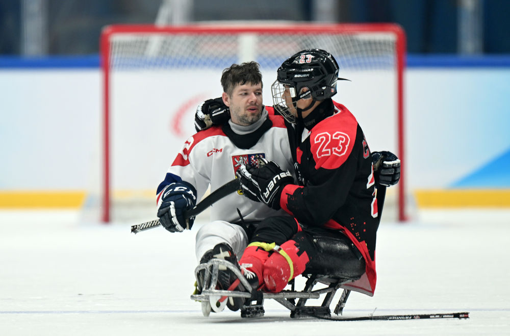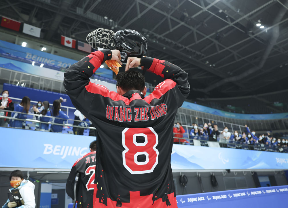 ↑3月9日,中國隊球員崔玉濤在北京國家體育館舉行的殘奧冰球決賽資格賽后向捷克隊球員致意。中國隊以4比3戰勝捷克隊。他們是對手,也是朋友。新華社記者 李尕 攝