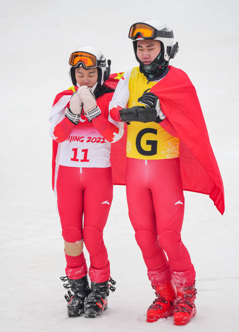 ↑3月11日,在北京延慶國家高山滑雪中心舉行的殘奧高山滑雪女子大回轉(視障)比賽后,獲得亞軍的中國選手朱大慶(左)和引導員閆寒寒身披國旗,并肩站在一起。朱大慶在上午第一輪比賽中摔到頭部,但在下午比賽中依舊堅持帶傷上陣,最終獲得銀牌。其實(shí),早在殘奧會(huì )開(kāi)幕前,朱大慶已傷到顱腦,她依舊參加了多項比賽。新華社記者 孫非 攝