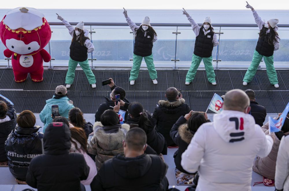 ↑3月8日,在張家口國家冬季兩項中心舉行的殘奧冬季兩項女子短距離自由技術(shù)(視障)決賽前,學(xué)生們在表演啦啦操。他們是最“安靜”卻最能點(diǎn)燃賽場(chǎng)觀(guān)賽情緒的“氣氛組”。組里的12名青少年是張家口市特殊教育學(xué)校聽(tīng)障學(xué)生,年齡最小的14歲,最大的20歲。他們身處“無(wú)聲”世界,卻用極富韻律的啦啦操溫暖整個(gè)賽場(chǎng)。新華社記者 胡虎虎 攝
