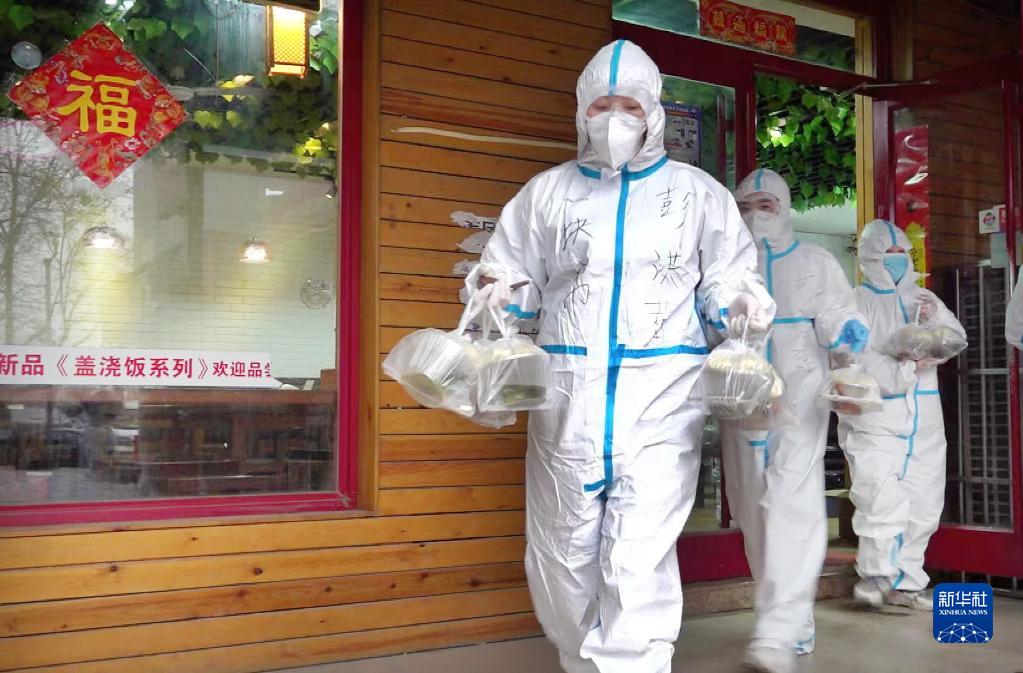 3月12日,山東青島萊西市“一塊幫”青年志愿者為一線(xiàn)抗疫人員取餐配送(視頻截圖)。新華社發(fā)