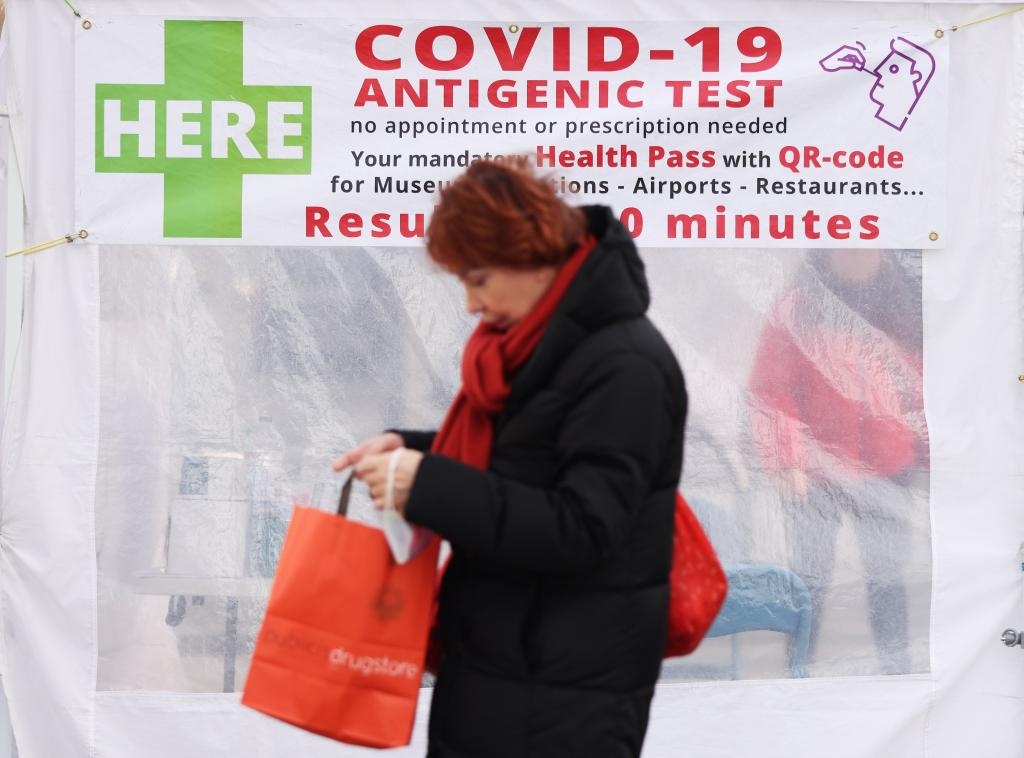 2021年12月23日,在法國巴黎香榭麗舍大街,一名女子拎著(zhù)購物袋走過(guò)一處新冠病毒快速檢測點(diǎn)。新華社記者高靜 攝