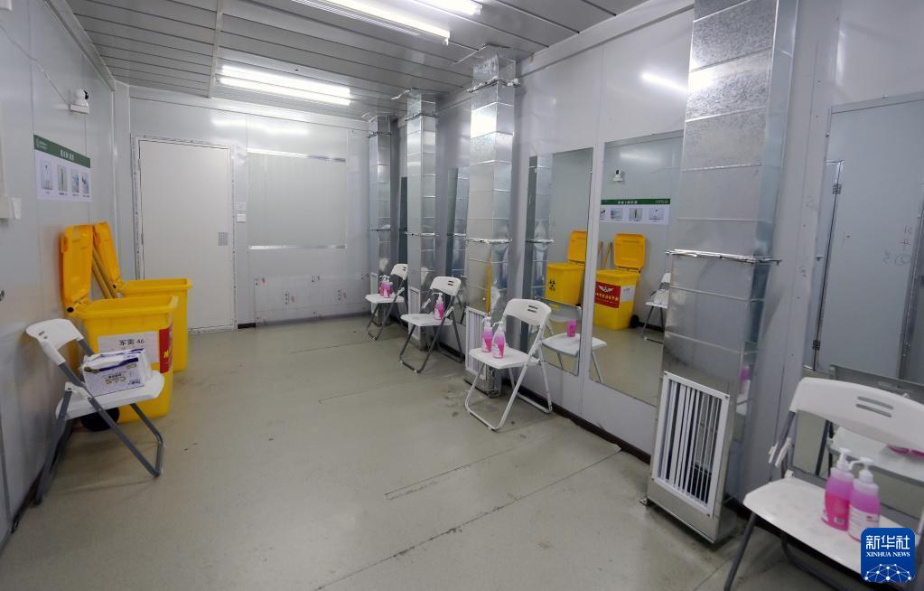 4月9日,醫務(wù)人員通道內防疫設施已經(jīng)準備就位。新華社記者 李賀 攝
