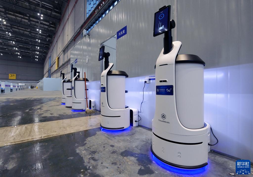 4月9日,在完工交付的“四葉草”方艙醫院3號館內,云端智能服務(wù)機器人已經(jīng)就位,即將為收治在這里的病患提供多種服務(wù)。新華社記者 李賀 攝
