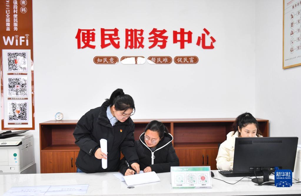 在山西省汾西縣僧念鎮段村,村黨支部書(shū)記李佳莉(中)在村委會(huì )處理事務(wù)(1月27日攝)。 新華社記者 柴婷 攝