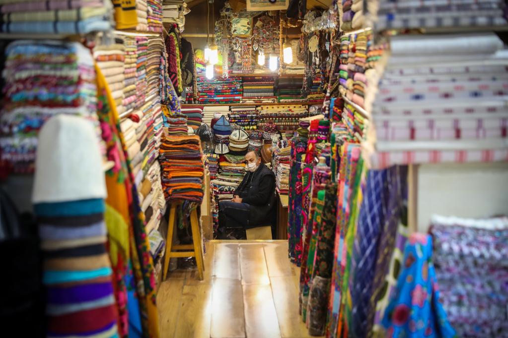 4月5日,商販坐在土耳其伊斯坦布爾大巴扎的店鋪內。新華社發(fā)(于納爾·恰姆攝)