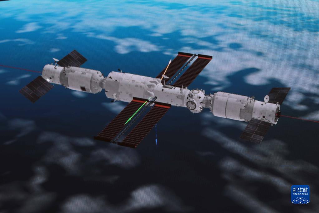 這是在北京航天飛行控制中心拍攝的天舟四號貨運飛船與空間站組合體完成自主快速交會(huì )對接示意圖(5月10日攝)。