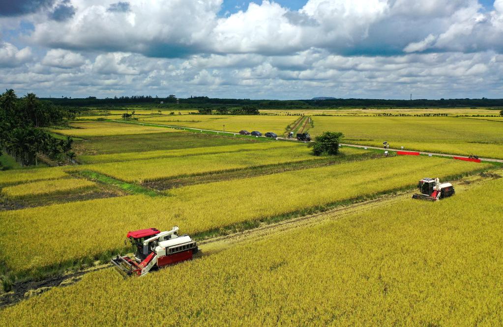 2022年5月21日,收割機在海南省??谑屑t旗鎮墨橋村的稻田作業(yè)(無(wú)人機照片)。新華社記者郭程攝