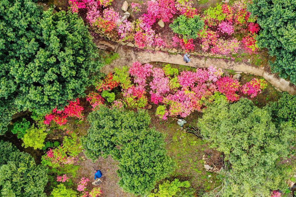 2022年4月14日,農民在浙江省湖州市長(cháng)興縣煤山鎮一生態(tài)果園內勞作(無(wú)人機照片)。新華社發(fā)(吳拯攝)