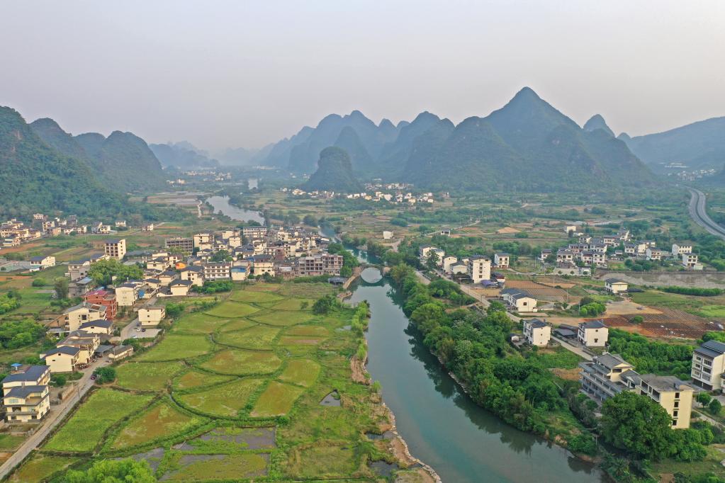 2022年4月11日,廣西桂林市陽(yáng)朔縣遇龍河沿岸山清水碧,宛如一幅山水田園畫(huà)卷(無(wú)人機照片)。新華社記者 周華 攝