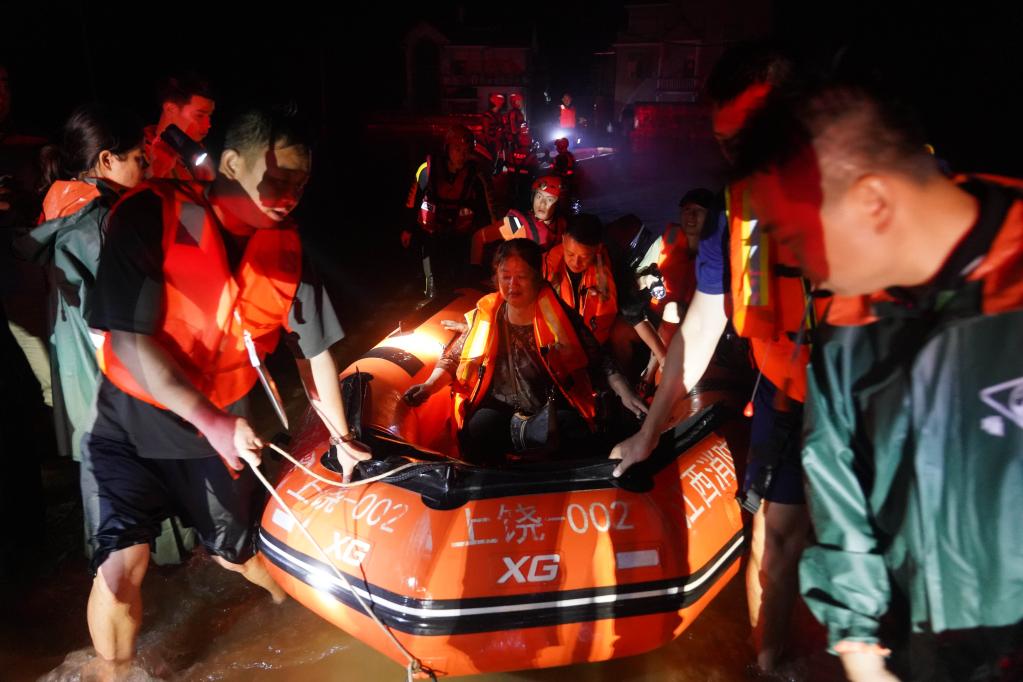 6月20日,德興市泗洲鎮,救援人員乘坐沖鋒舟進(jìn)入村莊轉移被困人員。新華社記者 周密 攝