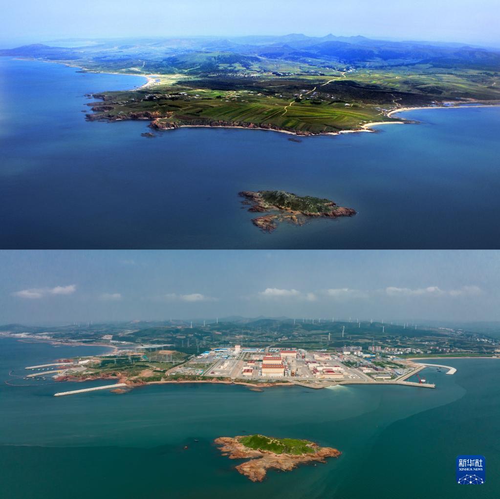 拼版照片:遼寧紅沿河核電站建成前(上)、全面投產(chǎn)后對比照片(上圖為2004年攝,下圖為2022年6月攝)。