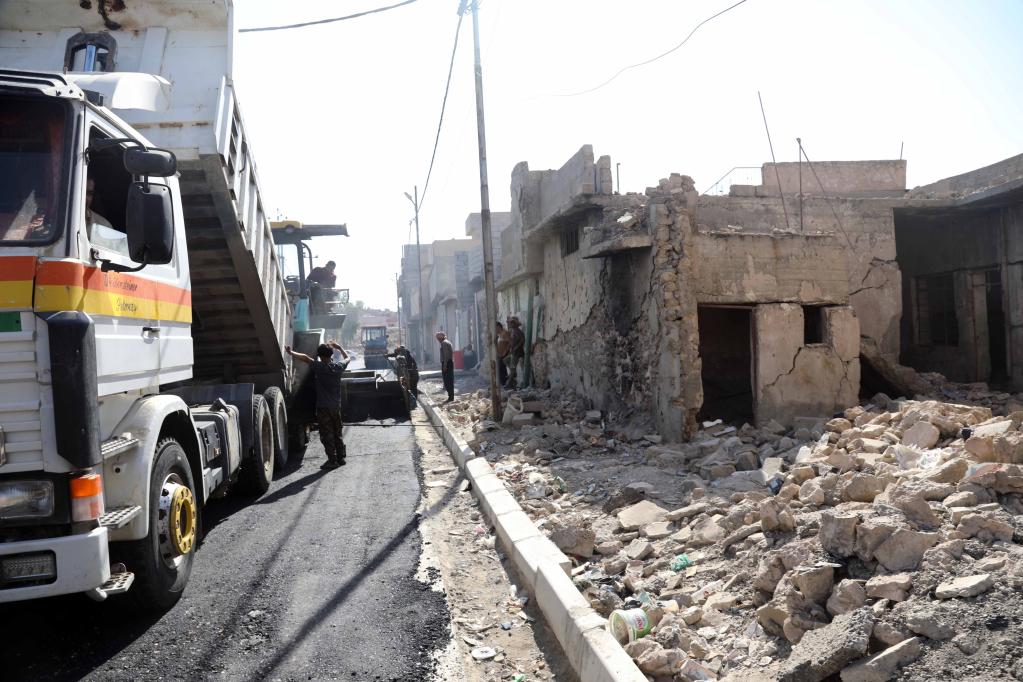 7月4日,工人在伊拉克摩蘇爾老城給馬路鋪瀝青。新華社發(fā)(哈利勒·達伍德攝)