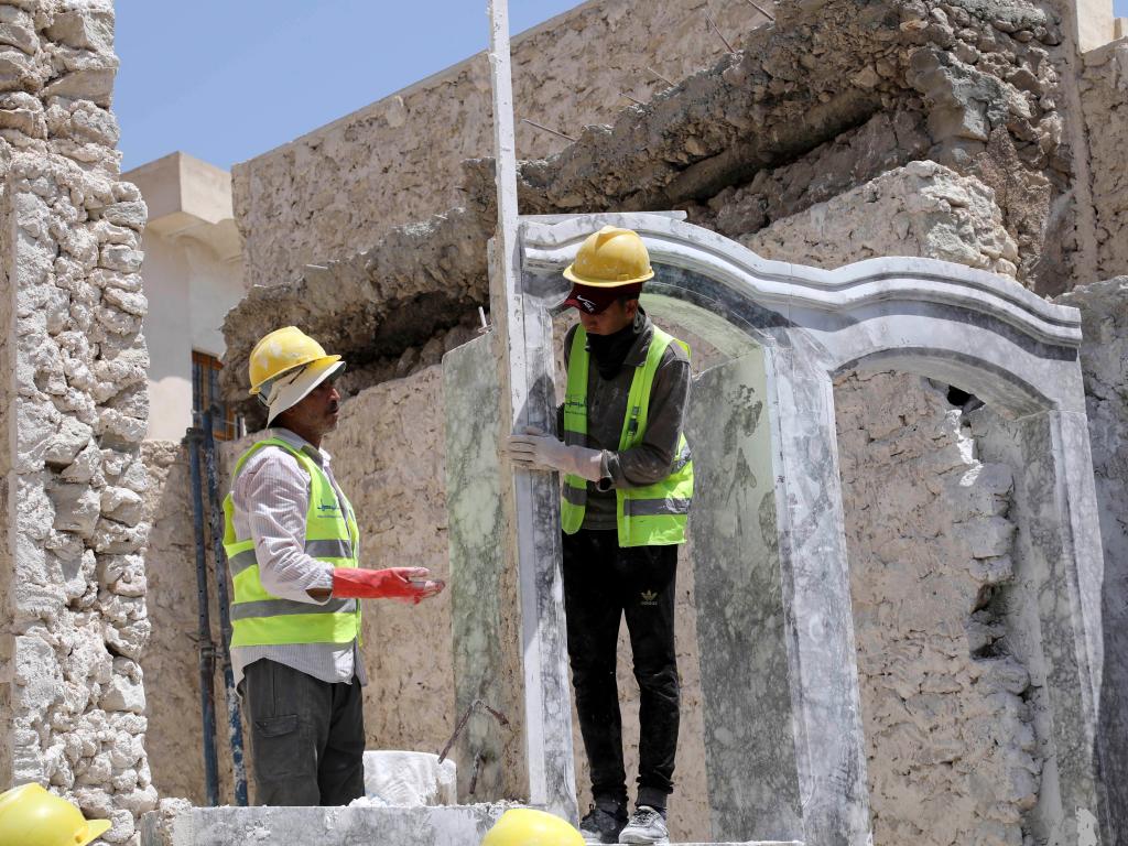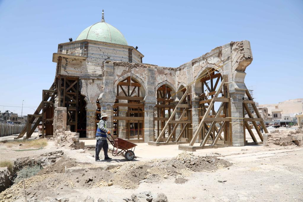 7月3日,工人在伊拉克摩蘇爾老城參與努里清真寺的修復施工。新華社發(fā)(哈利勒·達伍德攝)