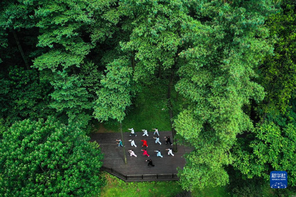 7月13日,市民在貴陽(yáng)市長(cháng)坡嶺國家級森林公園里健身(無(wú)人機照片)。 新華社記者 楊文斌 攝