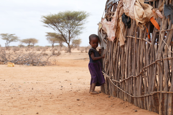 8月26日,一名兒童站在肯尼亞馬薩比特郡萊薩米斯鎮一干旱的村莊內。新華社記者董江輝攝