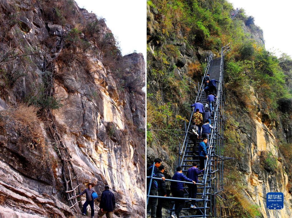 拼版照片:左圖為2013年2月22日拍攝的四川省涼山彝族自治州昭覺(jué)縣“懸崖村”阿土勒爾村的藤梯;右圖為2016年11月29日,在四川省涼山彝族自治州昭覺(jué)縣,人們沿著(zhù)剛建好的鋼梯登上“懸崖村”。新華社發(fā)(阿克鳩射 攝)