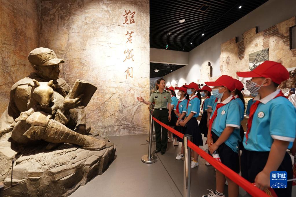 2021年5月30日,在位于河北省邢臺市信都區漿水鎮的中國人民抗日軍政大學(xué)陳列館,工作人員向小學(xué)生們講述抗大歷史。新華社記者 牟宇 攝