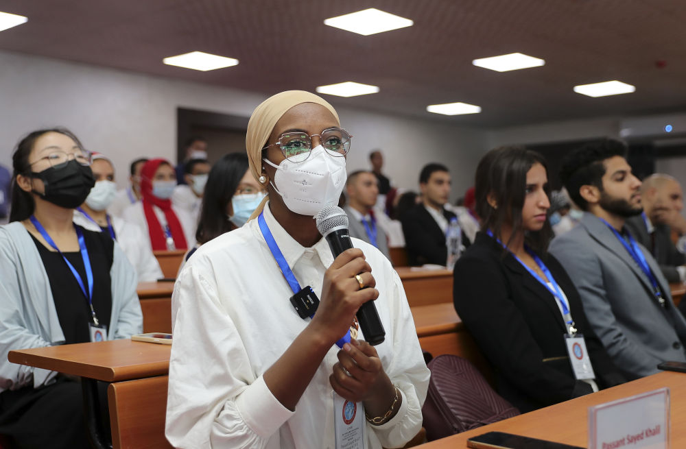 ↑9月6日,在埃及開(kāi)羅的“天宮對話(huà)”活動(dòng)埃及分會(huì )場(chǎng),一名開(kāi)羅大學(xué)青年漢語(yǔ)老師向中國首位女航天員劉洋提問(wèn)。新華社記者 王東震 攝