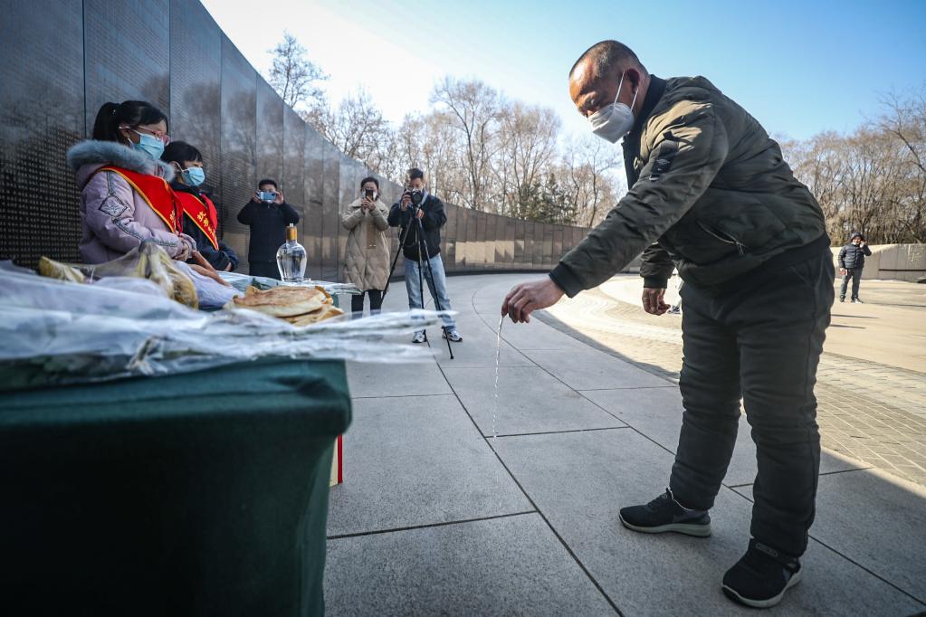 3月5日,展志忠的孫子展保成在沈陽(yáng)抗美援朝烈士陵園英名墻前祭祀自己的爺爺展志忠烈士。新華社記者 潘昱龍 攝