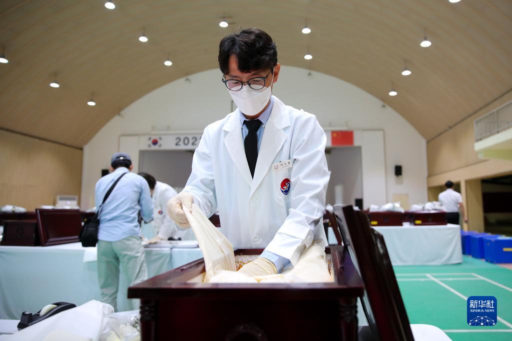 9月15日,在韓國仁川,韓方工作人員將志愿軍烈士遺骸入殮。新華社記者 王益亮 攝