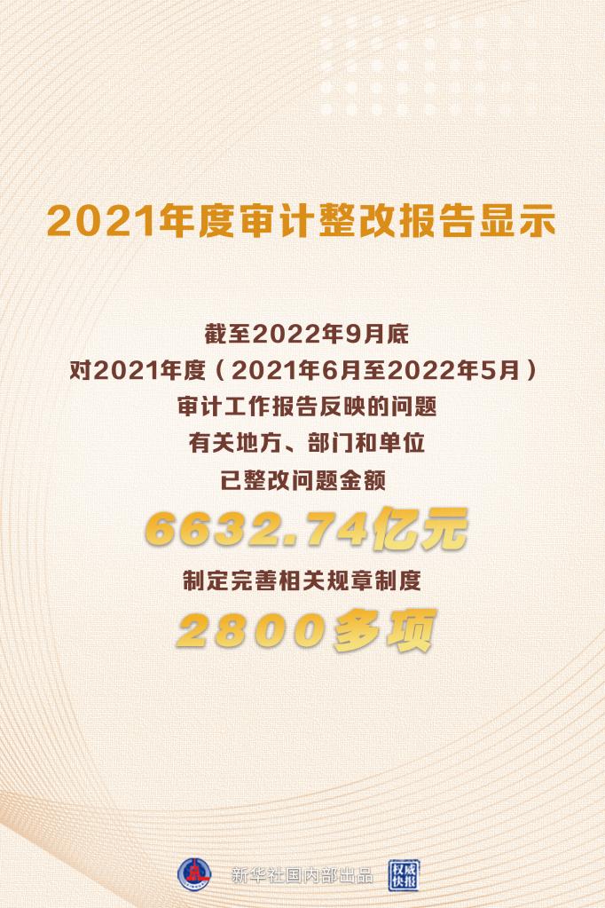 新華社北京12月28日電(記者鄒多為)報告顯示,截至2022年9月底,對于2021年度(2021年6月至2022年5月)審計工作報告反映的問(wèn)題,有關(guān)地方、部門(mén)和單位已整改問(wèn)題金額6632.74億元,制定完善相關(guān)規章制度2800多項,追責問(wèn)責1.4萬(wàn)人,糾治了一些阻礙改革發(fā)展和長(cháng)期未解決的頑瘴痼疾。