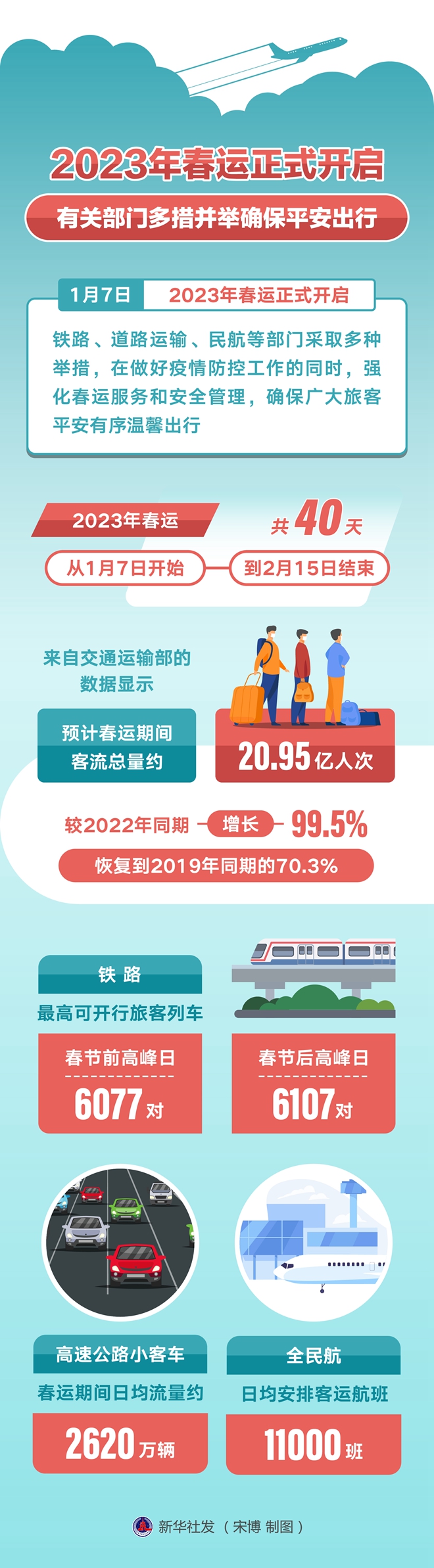 2023年春運從1月7日開(kāi)始,到2月15日結束,共40天。來(lái)自交通運輸部的數據顯示,預計春運期間客流總量約為20.95億人次,較2022年同期增長(cháng)99.5%,恢復到2019年同期的70.3%。鐵路春節前高峰日最高可開(kāi)行旅客列車(chē)6077對,節后高峰日最高可開(kāi)行旅客列車(chē)6107對,高速公路小客車(chē)春運期間日均流量約為2620萬(wàn)輛,全民航日均安排客運航班11000班。