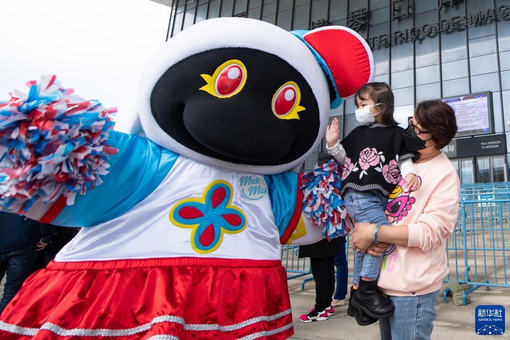 2月6日,廣東省赴澳門(mén)首發(fā)團成員和澳門(mén)吉祥物“麥麥”合影。新華社記者 張金加 攝