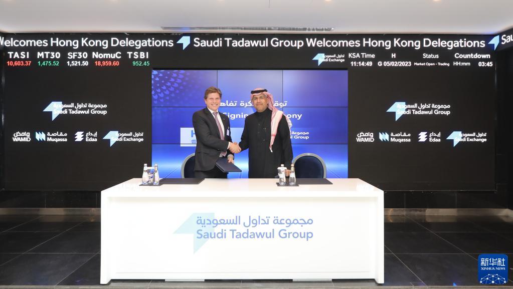 2月5日,在沙特阿拉伯首都利雅得,香港交易所集團行政總裁歐冠升(左)與沙特證交所集團首席執行官哈立德·胡桑簽署合作備忘錄。新華社發(fā)(香港交易所供圖)