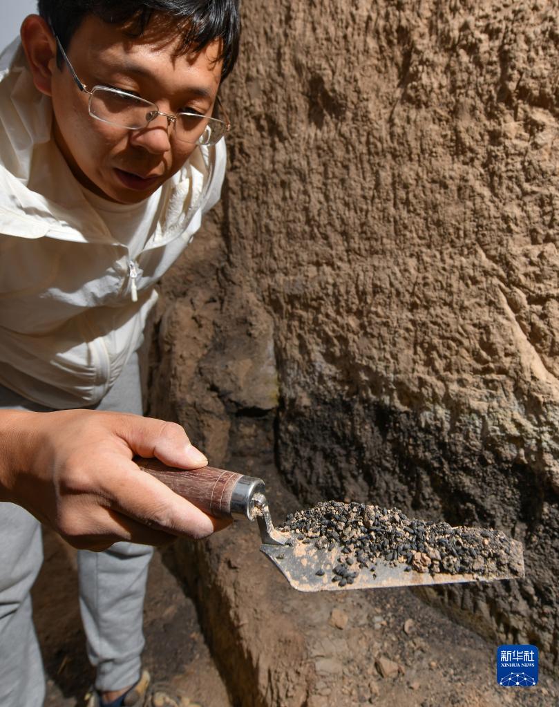 在甘肅慶陽(yáng)市南佐新石器時(shí)代遺址核心區大型宮殿建筑發(fā)掘現場(chǎng),考古隊員展示炭化水稻遺存(2022年8月23日攝)。新華社記者 李賀 攝