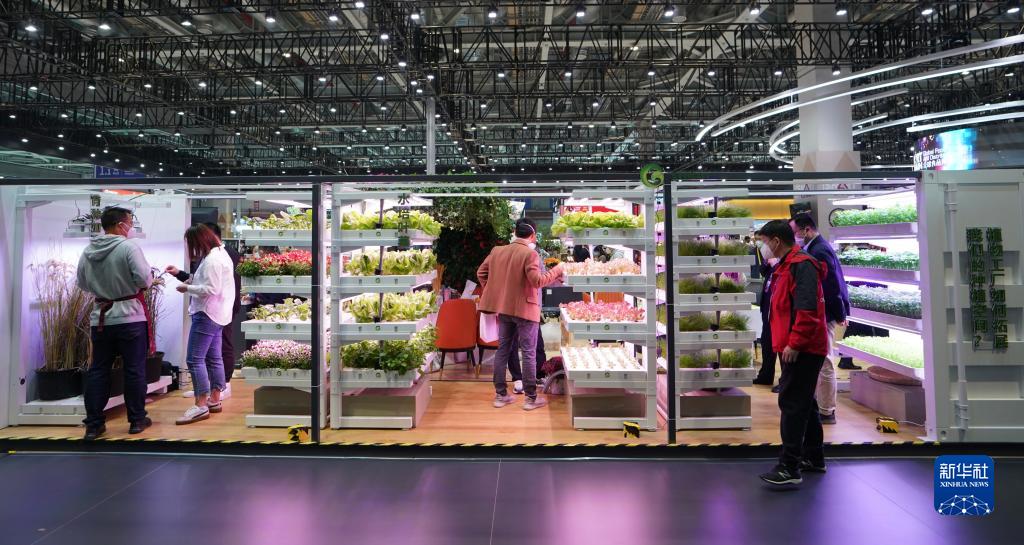 觀(guān)眾在第五屆進(jìn)博會(huì )食品及農產(chǎn)品展區參觀(guān)集裝箱植物工廠(chǎng)的模型(2022年11月7日攝)。新華社記者 劉穎 攝