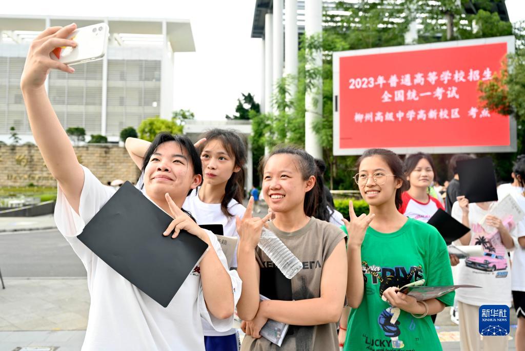 6月8日,在廣西柳州高中考點(diǎn),結束高考的考生在考場(chǎng)外留影。